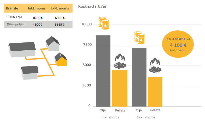 Pellets är ett lönsamt bränsle på grund av dess låga fukthalt och höga energiinnehåll. Nedan ser du en prisjämförelse mellan uppvärmning med olja och uppvärmning med pellets. Värmeförsörjningen avser tre byggnader, 1400 kvadratmeter totalt. Under ett år krävs 20 kubik olja eller 40 ton pellets.